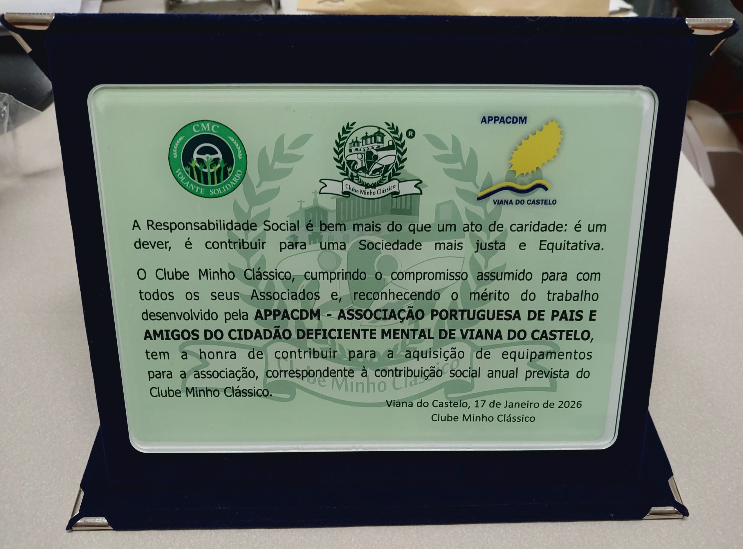 A Unidade do Cabedelo da APPACDM de Viana do Castelo vem, por este meio, expressar o seu mais sincero agradecimento pelo prémio Volante Solidário e generoso donativo para a aquisição de uma mesa de Ping-Pong que o Clube Minho Clássico atribuiu à nossa Unidade durante a realização da sua Ceia de Reis anual.